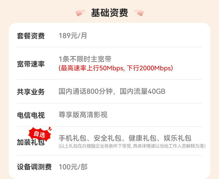 【套餐资费】套餐费189元/月,包括1条不限时主宽带(最高速率上行50Mbps下行2000Mbps),1部尊享版电视节目,1部固话月租和来显,手机和固话共享国内通话800分钟,手机共享国内流量40GB,套餐内固话手机川渝内互拨免费,手机国内接听免费。套餐内最多加装6部手机(第5部及以上加收10元/部/月)和6部电视(第2个及以上加收10元/部/月),合单收费。